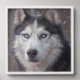 This digital painting depicts a Siberian Husky standing on snow, its fur glistening with frosty highlights as the winter landscape stretches endlessly behind it. The dog’s expressive eyes catch the viewer’s attention.