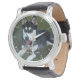 Siberian Husky puppy photography on Men's Vintage Black Leather Strap Watch. You can change for any other wrist watches for men, women and kids with this image - cute black and white with beautiful blue eyes sitting on the grass and watching straight.
