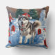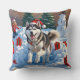Siberian Husky Running in Snow with Christmas Hat Throw Pillow