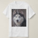 This digital painting depicts a Siberian Husky standing on snow, its fur glistening with frosty highlights as the winter landscape stretches endlessly behind it. The dog’s expressive eyes catch the viewer’s attention.