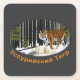 A Siberian Tiger emerges from a snow-laden forest in the Russian Far East. The Siberian Tiger is also known as the Amur Tiger and the Ussuri Tiger. Russian (Cyrillic) text beneath the image reads "Ussuriiskii Tigr" (Ussuri Tiger). Add your own additional text on the reverse side. Largest of the tiger sub-species, the Amur, or Siberian, Tiger is highly endangered. They are found in the Amur River area on the border of China and Russia. A few may still survive in North Korea.