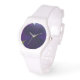 I only have one complaint. I ordered the watch with clear case and strap, and what was sent was white case and strap. I'm going to keep it because 1) it looks very nice in white, and 2) it would take too long to get a replacement made and sent in time for my occasion. Aside from the mix up with the color, the watch does look very good in white. The purple dial is actually sparkly which did not show in the online images. That was a nice surprise. If you like Swatch watches this is very similar to those. It's 33.6mm in diameter, 10.5mm thick, and 40.6mm lug to lug. Stainless steel case back says 3ATM/30m WR, so no swimming or showering or submerging this one. If you like Woodstock, this is a great choice.