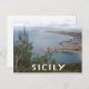Sicily Coast photo with architecture and beach. Beautiful scene of the largest island in the Mediterranean sea, off the coast of Italy. The name sicily in modern typography at bottom in white.