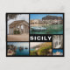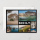 Postcard of a collage with multiple photos of beaches, Roman temple, Scopello, salt pans and Cefalù on the island of Sicily in Italy in a black frame with the text: 'Sicily'.
