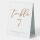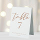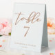 This custom sienna brown wedding table number table tent sign is a warm regal color for a bride or groom looking for a blend between soft and masculine. The lovely tan minimalist script features simple cursive typography along with a chic, modern serif font. This soft brown is perfect for a fall afternoon event.
