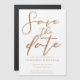 This sienna brown script Save the Date magnetic invitation is a warm regal color for a bride or groom looking for a blend between soft and masculine. The lovely tan minimalist typography features simple cursive text above a chic, modern serif font. This flexible magnet invite works for both afternoon and evening weddings.