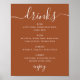 A modern wedding drinks menu sign with a clean, organized layout for presenting your bar selection. Drinks are arranged into clear categories such as beer, wine, spirits, and non-alcoholic options, so guests can quickly find what they’re looking for. The combination of a flowing script title and structured typography keeps the design balanced and polished. The warm sienna (terracotta brown) background adds depth and pairs naturally with earthy, neutral, and sunset inspired color palettes. Perfect for displaying at the bar or drink station, where guests can easily check the available drinks. A great fit for fall weddings, desert venues, outdoor celebrations, and modern minimalist weddings with warm tones. Available as both a printed poster and a digital download.