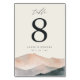 Guide guests to their seats in style with this 3.5x5" table number card from the Sierra Dusk collection by Redwood & Vine Design Co. Featuring a bold table number and elegant typography over a serene watercolor mountain landscape in warm blush and slate hues, this petite card adds a modern rustic touch to your reception tables. Ideal for mountain, desert, or outdoor weddings, and fully customizable to include your names and wedding date. Part of the Sierra Dusk suite.