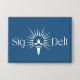 This distinguished design prominently features the official emblem of the Sigma Delta Tau sorority. At its center, a stylized torch radiates light outward in a bold sunburst pattern, symbolizing enlightenment and shared brilliance. The design gracefully incorporates partial text, subtly representing the sorority's name around the central emblem. This powerful representation embodies Sigma Delta Tau's enduring spirit, sisterhood, and identity, making it a recognizable symbol for members and supporters.