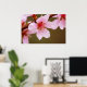 a close up digital photograph, still life, of a pink peach bloom on a branch showing petals, stamen, and the center of the blossom with other blooms surrounding it.