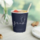 Signature script "grad", graduation party paper cups. White typography on navy blue background.