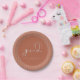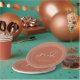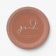 Signature script "grad", graduation party paper plates. White typography on rust orange background with delicate deco pattern border.