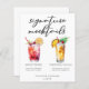 This chic signature mocktails menu sheet features simple black tyopgraphy above 2 cute drinks and their ingredients for your wedding bar. A Shirley Temple and non-alcoholic virgin Piña Colada add a cool flair to your bar menu. Complete with the couple's names and date for their reception.