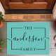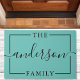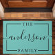 Signature Script Personalized Teal Modern Family Name Doormat. This elegant design is the perfect housewarming gift for newlyweds or new homeowners. Trendy hand lettered script is paired with a serif font for a rustic look.