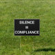 Encourage people to protest racist and xenophobic comments with a "SILENCE = COMPLIANCE" yard sign in bold white letters on a black background.
