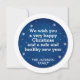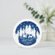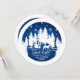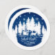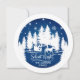 Christmas round sticker featuring white pines silhouettes with snowflakes and a horse-drawn sleigh on a blue background, with the wording Silent night in handwritten lettering. Easily customizable by adding your own family name or text