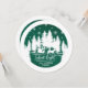 Christmas round sticker featuring white pines silhouettes with snowflakes and a horse-drawn sleigh on a green background, with the wording Silent night in handwritten lettering. Easily customizable by adding your own family name or text