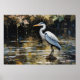 "Silent Reflection" blends nature and digital art in an ethereal scene. A majestic heron stands still on a pixelated lake, surrounded by golden leaves and geometric ripples. A contemporary touch for spaces that invite serenity and contemplation.
