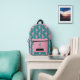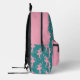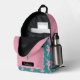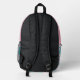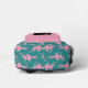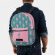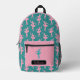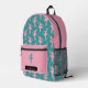 This backpack features a pattern of a pink silhouette ballerina on a teal background for the main body. The pocket, however, is matching pink with one single teal dancer, and your name in pink on a black banner beneath the image. The top of the bag is also solid pink, making a nice modern contrast.