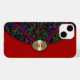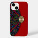 This iPhone 14 Case by ZoeSPEAK is designed in the style of a clutch bag. The flap cover of the bag is a colorful terrazzo pattern, mainly dark grays, but sprinkled throughout with flecks of reds, blues and greens. The lower part of the bag, under the flap, is terracotta in color with a slight silk fabric texture. The flap closure is a gold oval curving outward, with a monogram which can be personalized or deleted. On the silk terrazzo , spreading out from the gold oval to the upper corners, are two ribbon bands of terracotta with blue violet edges.