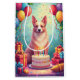 A cheerful birthday scene featuring a Silken Windhound enjoying a festive celebration surrounded by colorful balloons, presents, and a bright birthday cake. The flowing coat and graceful look create a joyful design full of charm and elegance.