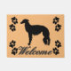 Silken Windhound silhouette with paw prints and "Welcome" text in black.