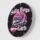 This empowering wall clock makes a playful yet powerful statement about women in trucking. Against a black background with a pink rim, it features a purple semi-truck and the bold text: "Silly Boys Trucks Are For Girls". It's an ideal gift for any female truck driver who takes pride in breaking stereotypes. The design tool can also be used to add custom text if you want your name or company on this clock. You can customize the color of the frame to any color you desire by going into the design tool.
