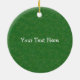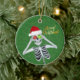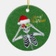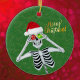 This hanging ceramic ornament has a silly skeleton holding red and green ornaments up to his eyes while smiling and wearing a fur trimmed red Santa Claus hat on a green background with faux gold glittery specks. Merry Christmas text in gold on the front. Customize your text on the back with the template.