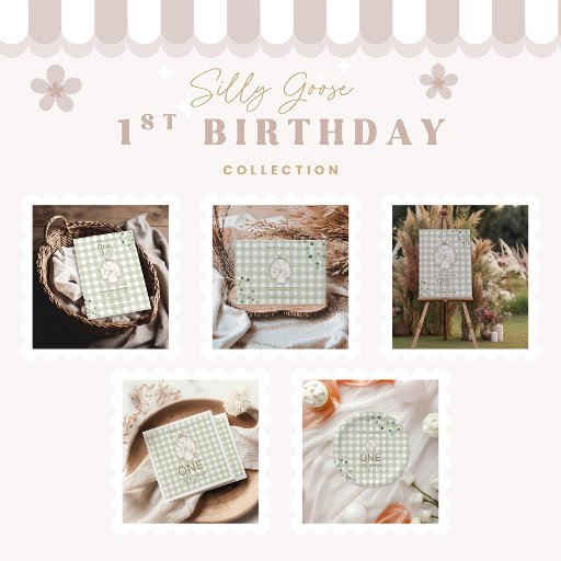 This charming silly goose first birthday invitation features a soft green gingham background, floral confetti, and a hand-painted duckling framed in a vintage-style ribbon crest. The whimsical illustration and cozy pastel palette bring a playful, nostalgic feel to your baby girl's big celebration. Personalize the text to suit your little one's party details. A lovely option for rustic, cottagecore, and coquette-themed birthdays.