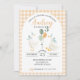 This charming invitation features a whimsical, watercolor design with two cute geese wearing little party hats, set against a stylish tan/orange and white checkered plaid background (or gingham). The design has an arch shape and includes popular colors like sage green, dusty orange, and cream.