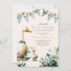 Celebrate your little silly goose with this irresistibly cute boy baby shower invitation. The front features a warm cream background with soft watercolor bunting adorned with daisy florals, a sweet gosling gazing up at its mama goose, and charming, whimsical details that feel both playful and heartfelt.