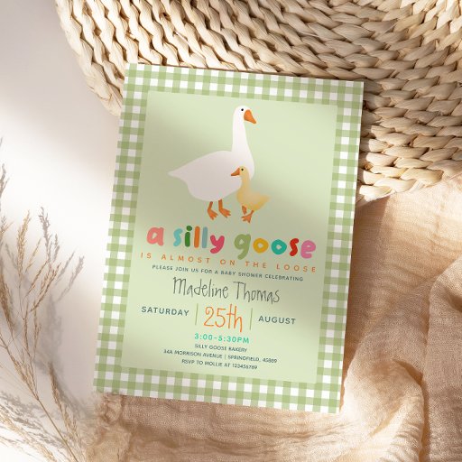 This cute and playful silly goose baby shower diaper raffle card features a charming goose design with fun, modern typography. The reverse showcases bright sage green gingham. There’s space to invite guests to bring diapers for a raffle—use the provided wording or customize your own. Perfect for a goose themed, farmhouse, or gender-neutral baby shower, with matching invitations available in the collection.