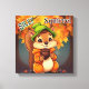 An adorable picture for a child's room. A cute squirrel holding an acorn sitting in the woods surrounded by Fall leaves.