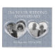 Customized silver wedding anniversary card personalize with two photos, year of marriage and inside words. Example reads 25th Silver Wedding Anniversary and your date. A great anniversary gift for a puzzlers. Double silver metal heart effect art for a now and then photo or individual photos, original graphic art and design by Sarah Trett for www.mylittleeden.com