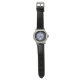 A nautical chrome like anchor design graphic decor on blue stripes. A modern nautical fashion watch gift sure to make an impression on, or off the boat.