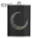 A shiny silver crescent moon in a Celtic knot style design on a black background.