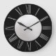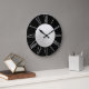 This elegant and glamorous wall clock features a simple black and silver theme. The center features a faux metallic style silver foil. The outer frame is a solid black. The hours are printed as Roman numerals in a shiny looking gold foil.