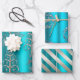 A gorgeous teal (or aqua) and silver Christmas wrapping paper featuring three different designs. The first sheet consists of a very colorful metallic aqua gradient base with silver Christmas trees and reindeer, with the words 'Merry and Bright'. The second sheet has an aqua background with silver reindeer inside metallic silver wreaths, and the third sheet has a pattern of aqua and silver diagonal stripes.