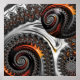 Stunning silver and orange Mandelbrot fractal with spirals and a sphere reflecting the image