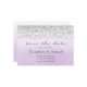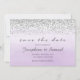 Save the date announcement with faux silver glitter design and ombre purple lavender watercolor background.