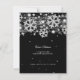 Elegant "50th Birthday Party" design with Silver Faux Glitter Snowflakes & bokeh glowing lights on Black background, and custom name + details text.