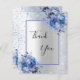 Faux silver looking background, decorated with light blue faux glitter, sparkles and blue florals.On front large hand lettered script and the text: Thank You.