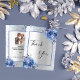 Faux silver looking background, decorated with light blue faux glitter, sparkles and blue florals.On front large hand lettered script and the text: Thank You.