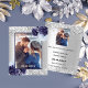 Faux silver looking background, decorated with navy blue and light blue florals, flowers and faux silver confetti. Personalize and add your photo, names and wedding details.