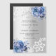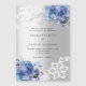 For an elegant and romantic wedding. A faux silver looking background decorated with blue florals, roses and white lace. Personalize and add your names and details.