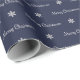 A silver and blue merry christmas pattern with snowflakes on wrapping paper.