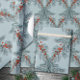 An elegant, sophisticated and festive holiday wrapping paper featuring blue spruce branches and red ilex berries in lattice formation on a dusty blue color background.
