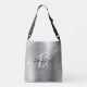 This elegant personalized crossbody bag features a monogram and first name in modern black and white script on a silver faux brushed metal background.