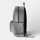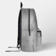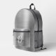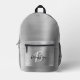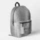 This personalized backpack features a monogram and first name in modern black and white script on an elegant silver faux brushed metal background.