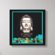 A silver Buddha head statue reflecting on black water filled with floating turquoise lotus flowers and green lily pads. Surrounded by a blue turquoise border and a black background.
